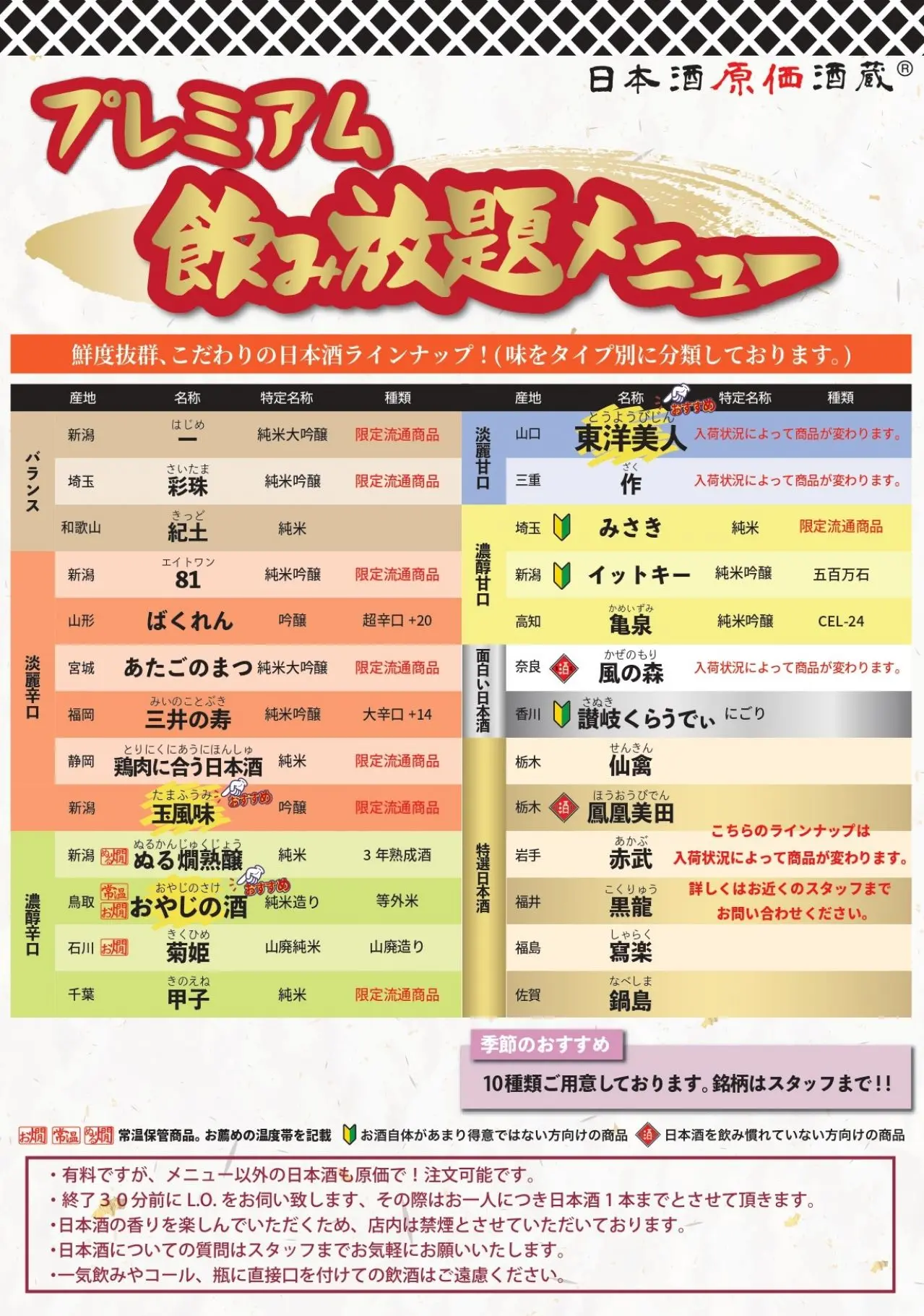 当プランでは豪華日本酒8種類に加え、日本酒に合うお料理はもちろん、特定名称酒35種が含まれたプレミアム飲み放題付きとなっております。