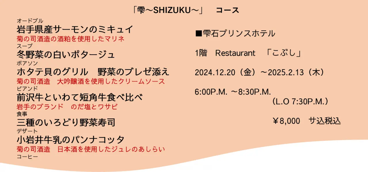 【雫石プリンスホテル】県内最古の酒造会社との雫石町内地域連携冬を彩る「菊の司酒造とのコラボ」創作ディナー提供を開始
