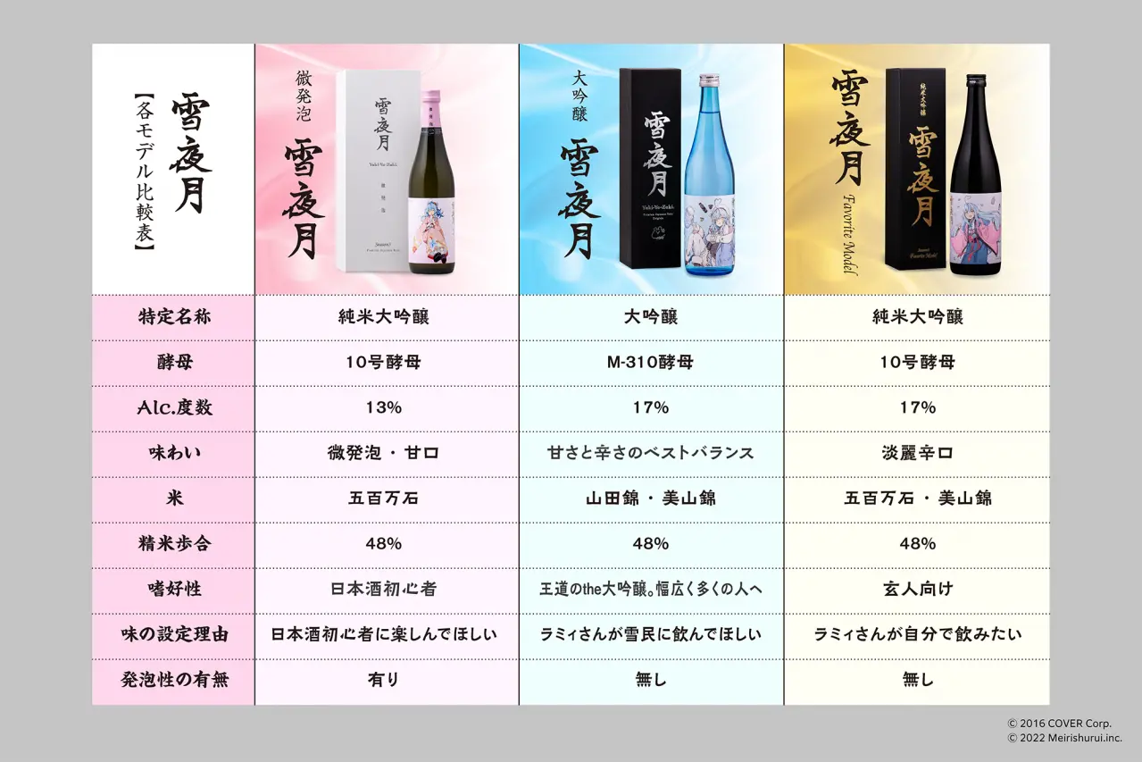 「日本酒の魅力を世界に伝えていく」ことを目指す、雪花ラミィと明利酒類によるプロジェクト。「雪夜月」は雪花ラミィが、原料米や精米歩合、酵母、アルコール度数に至るまで全てイチから考え抜いた一本であり、結果的に日本酒の世界大会IWC2022、IWC2023にて2年連続でブロンズメダルを受賞する等、世界からも高評価を得ており、唯一無二のコラボレーションになっている。